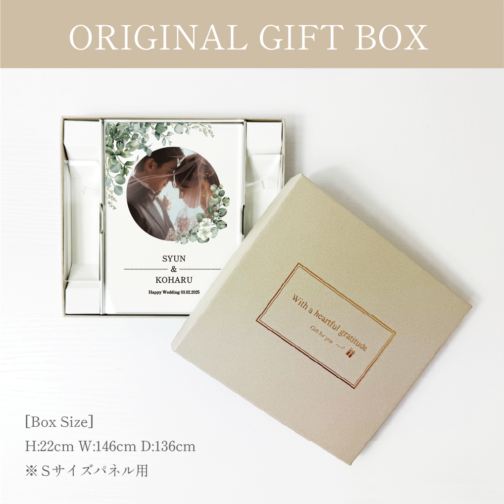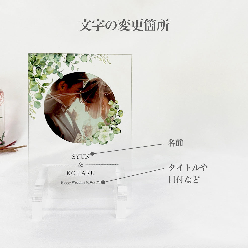 お気に入りの写真をアクリルパネルに印刷し、結婚式のデザインで特別感をプラス。