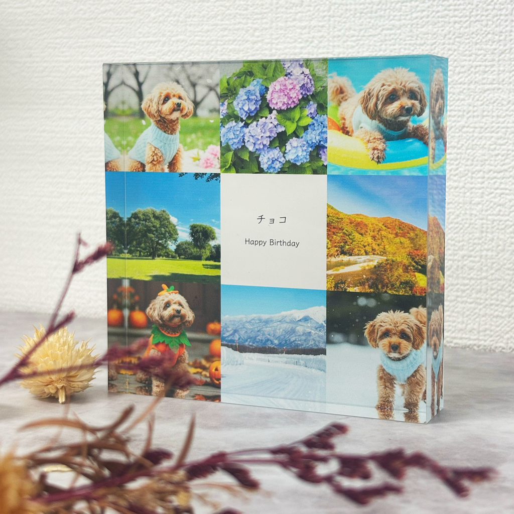 お好きな写真8枚とメッセージをアクリルブロックに印刷。